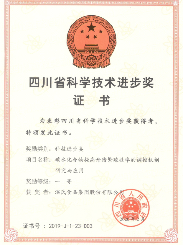 四川省科技前进奖一等奖-《碳水化合物提高母猪滋生效率的调控机制研究与应用》